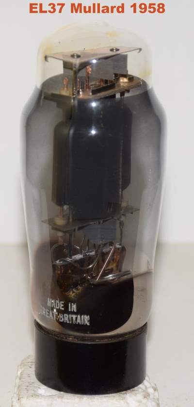 EL37 Mullard UK black plate used/good 75%, 2 round "O" getter halos, faded printing
