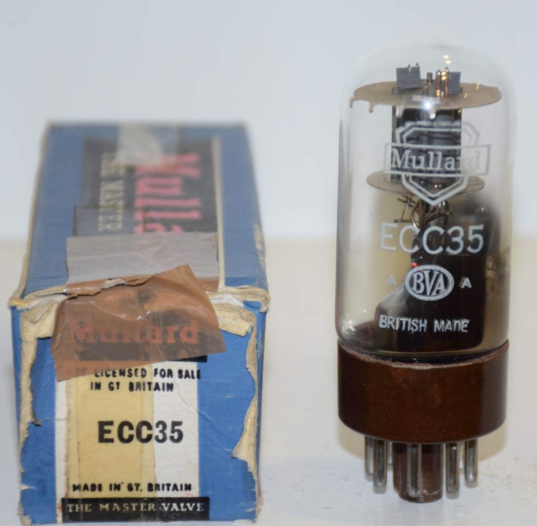 1 low noise tube) ECC35=6SL7GT Mullard brown base "D" getter halo NOS 1950-1955 era