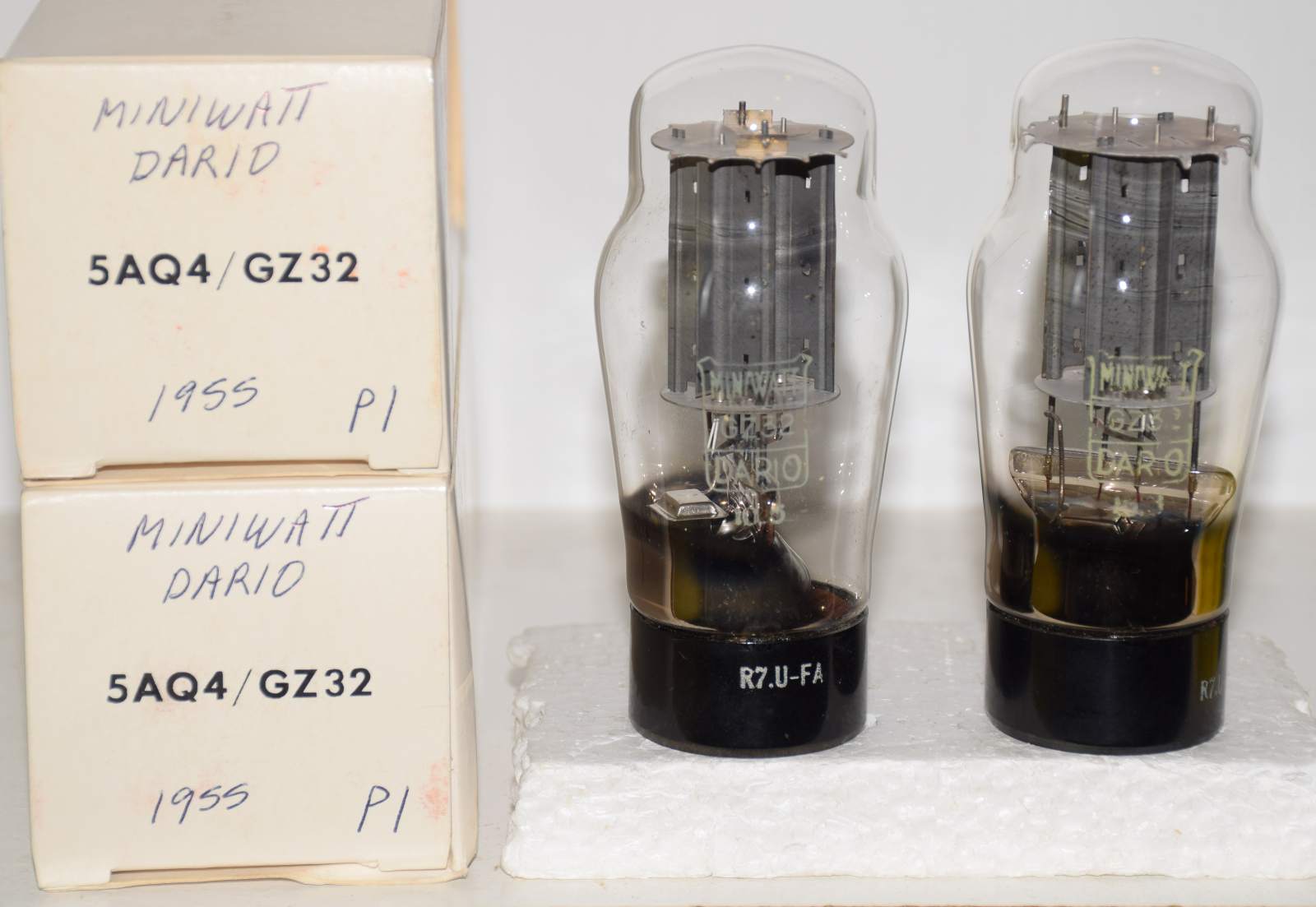 1 pair) GZ32 Miniwatt Dario France NOS 1955 small rattle inside each base from dried glue particles - upside down platter shape getter, good printing
