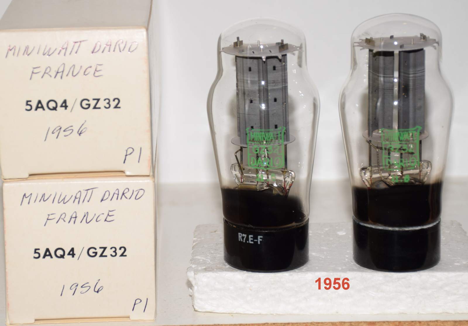 1 pair) GZ32 Miniwatt Dario France NOS 1956 small rattle inside each base from dried glue particles - upside down platter shape getter, good printing