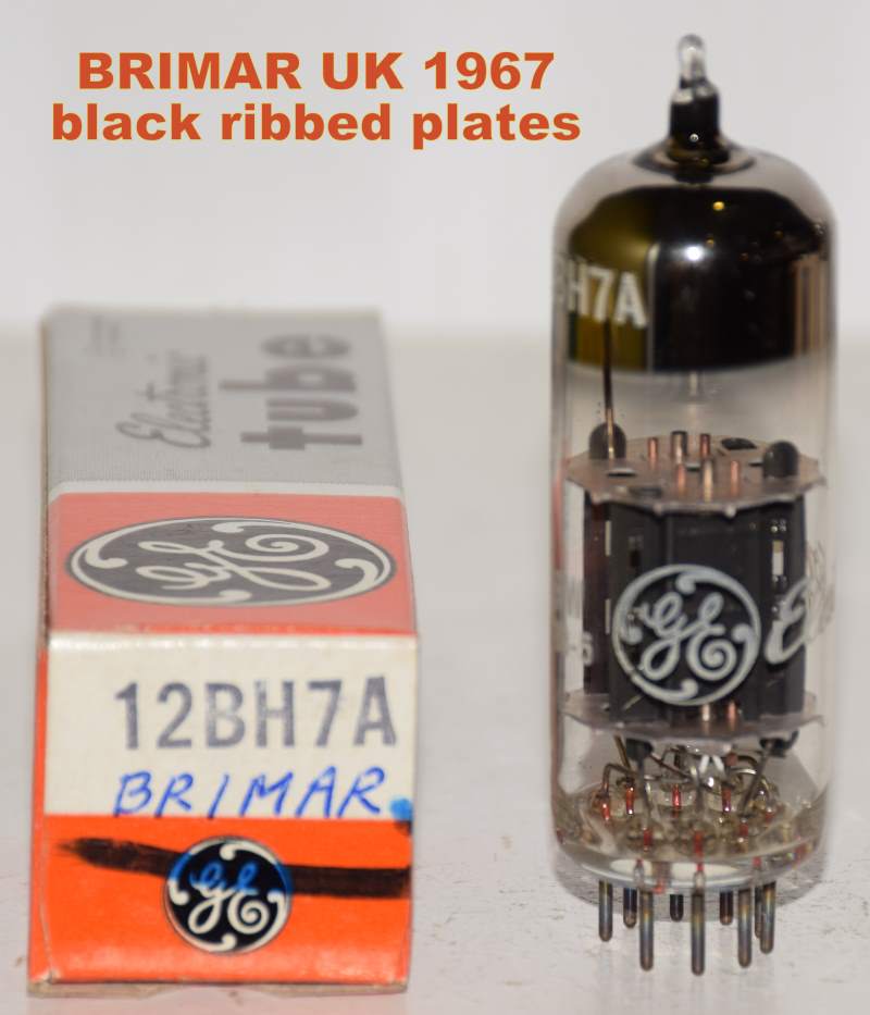 1 low noise tube) 12BH7A Brimar UK rebranded GE short ribbed black plates 1967 (FW) large "O" getter halo